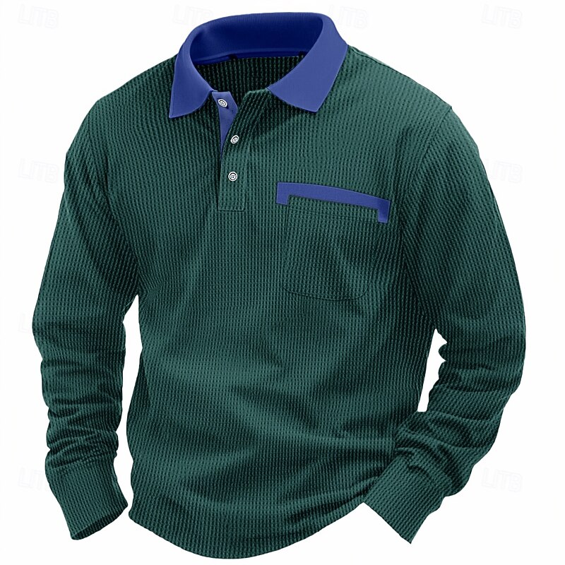 More information about Men's Waffle Polo Shirts Polo Shirts Formal Business Lapel Classic Long Sleeve Fashion Basic Solid Color Patchwork Buttons Spring & Fall Regular Fit Black White Burgundy Navy Blue Royal Blue Dark