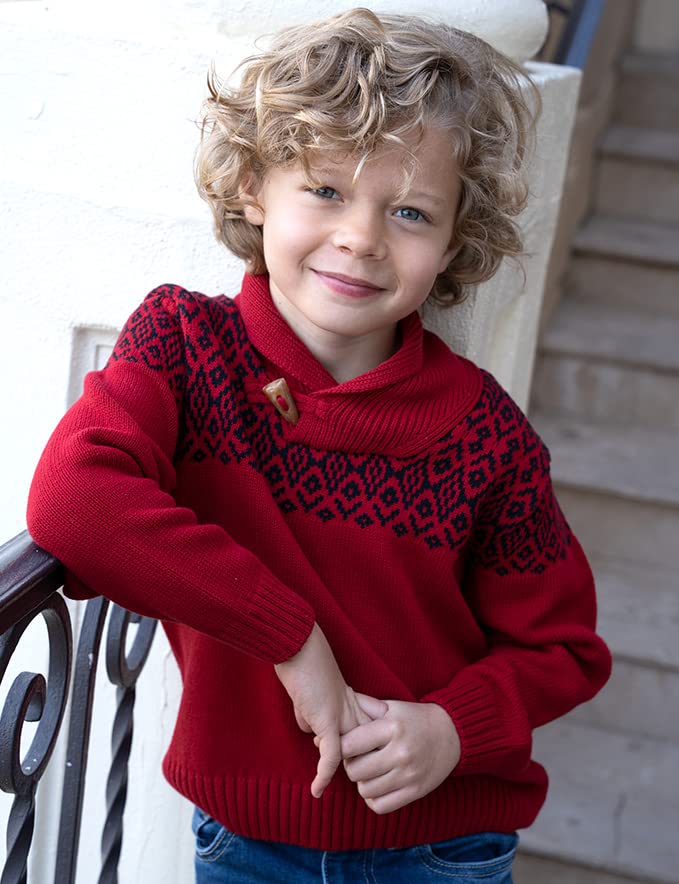 • This shawl collar with button closure will help keep your boys neck warm when temperatures drop. A ribbed hem for a flattering fit completes the sweater. The perfect Christmas sweater