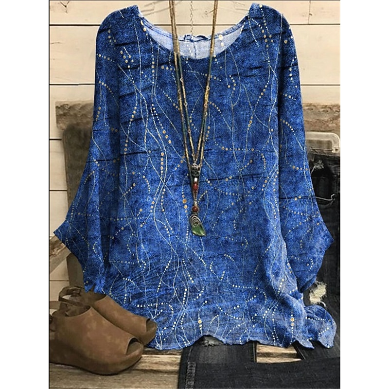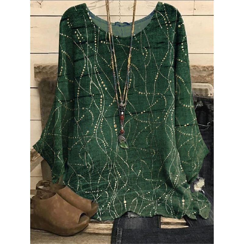 : Featuring an earthy green hue and intricate chain print, this blouse adds an artistic flair to any wardrobe. The dolman sleeves and round neckline create a graceful and versatile finish, suitable for both casual and semi-formal occasions.