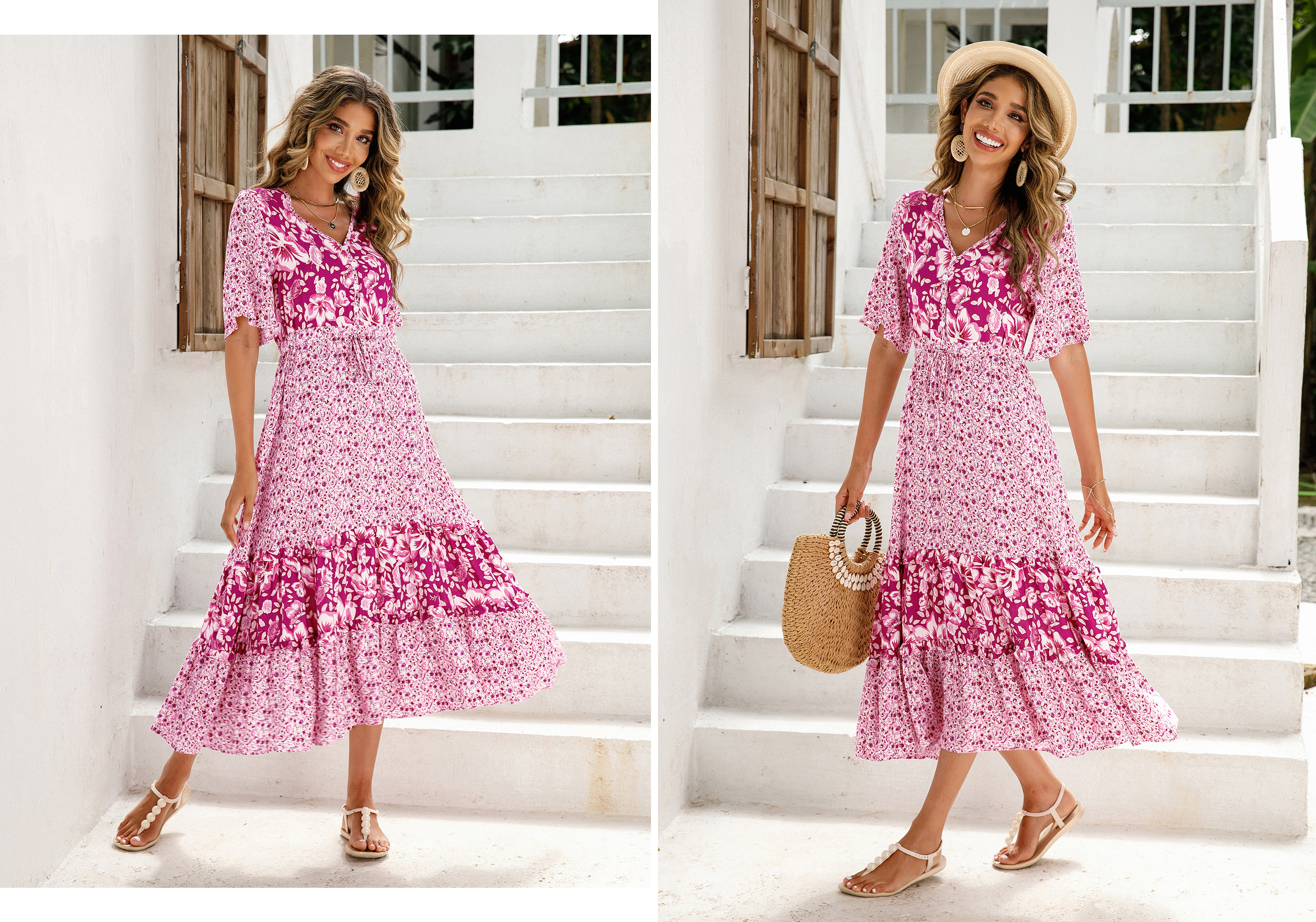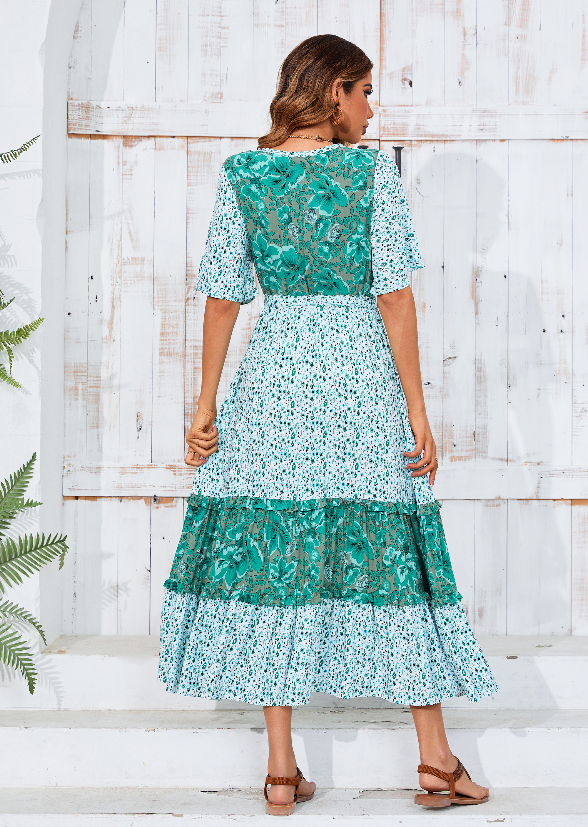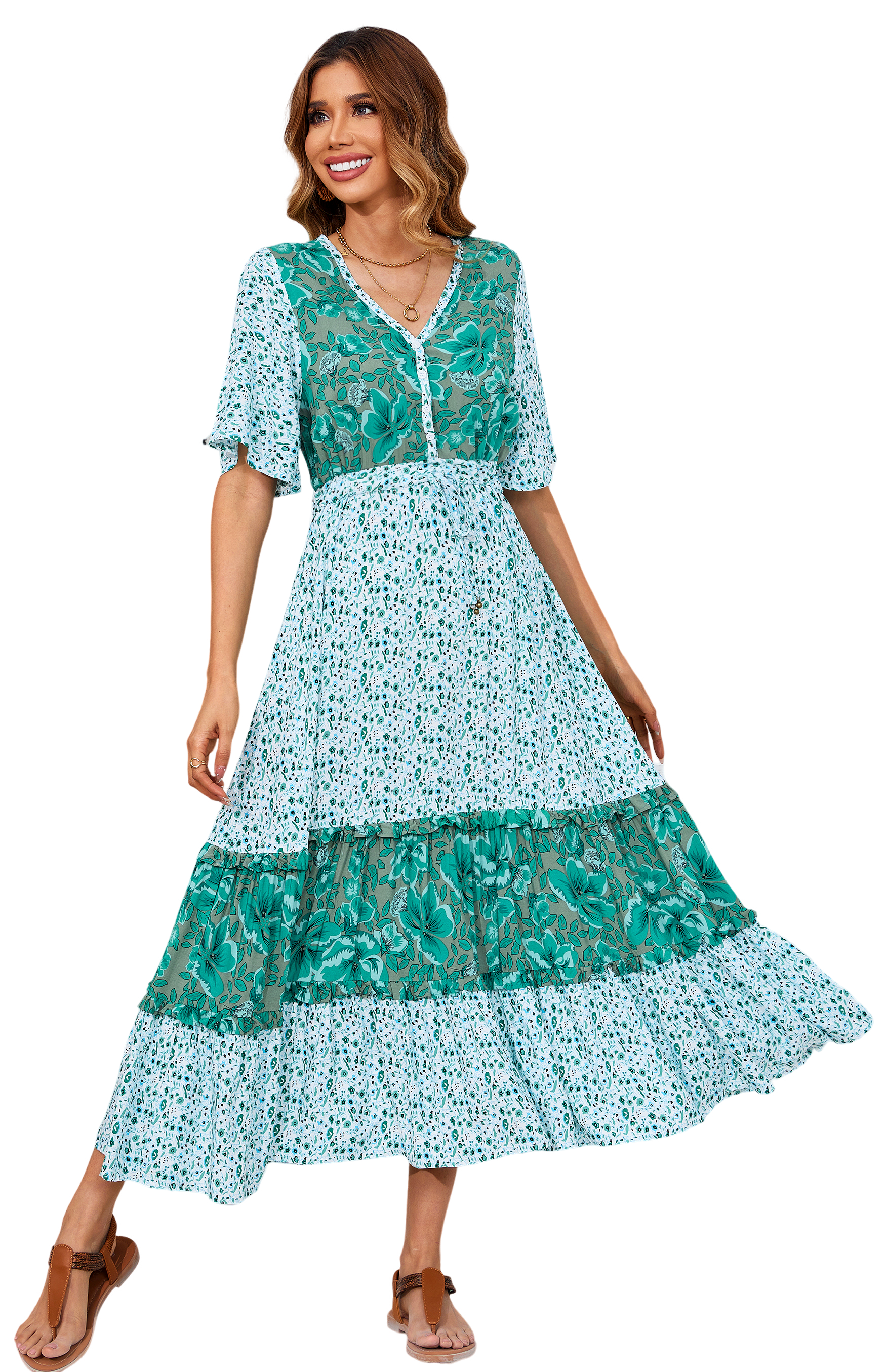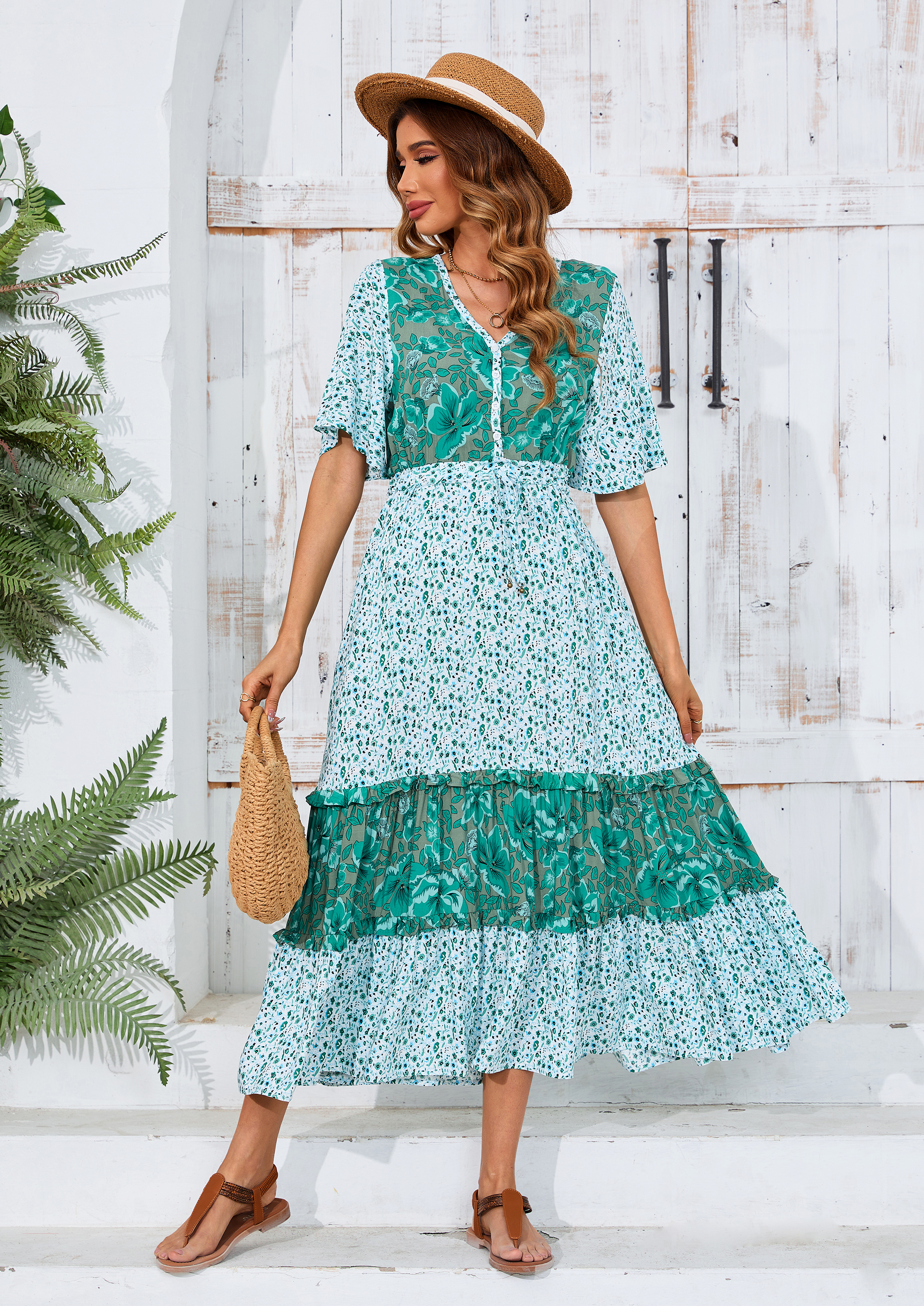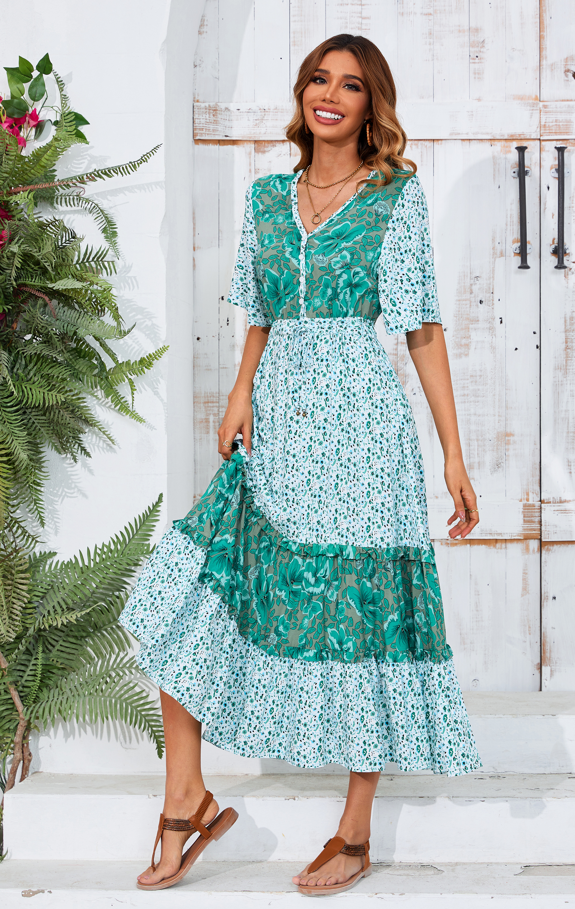 The ruffle patchwork hem is not only on-trendy but also flattering while floral print adds a bohemian flair that is perfect for summer vibes. The length hits just right for a midi dress, sandals/heels/boots work well with this length.