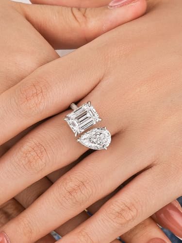 Toi et Moi 4.5CT Emerald & 3.5CT Pear Cut Two Stone Engagement Ring for Women, Sterling Silver 5A Cubic Zirconia Simulated Diamonds Ring with Open Bypass Design 4