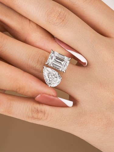 Toi et Moi 4.5CT Emerald & 3.5CT Pear Cut Two Stone Engagement Ring for Women, Sterling Silver 5A Cubic Zirconia Simulated Diamonds Ring with Open Bypass Design 6