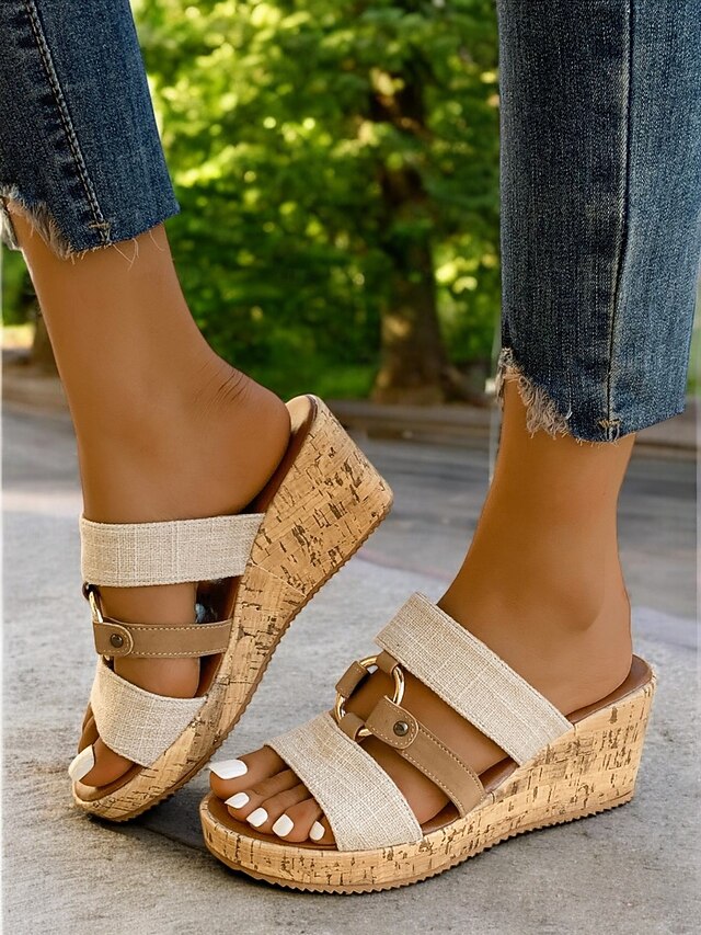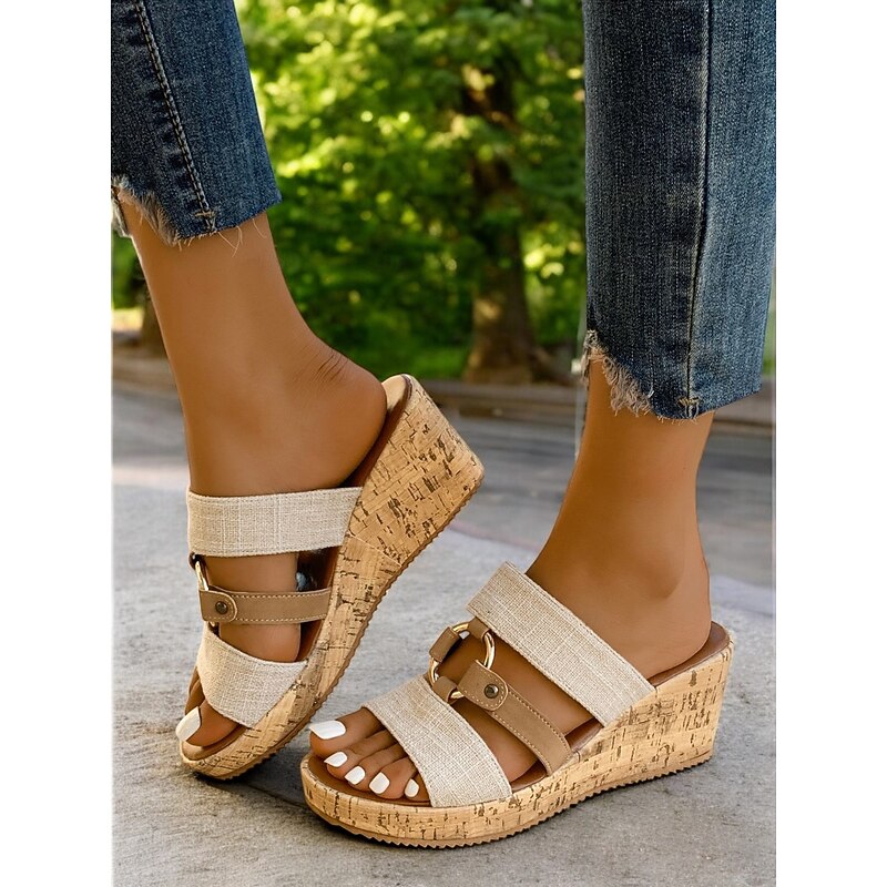 HOT ! Women's Beige Wedge Sandals – Stylish Summer Slip-On Sandals with Buckle Straps for Casual & Beach Wear