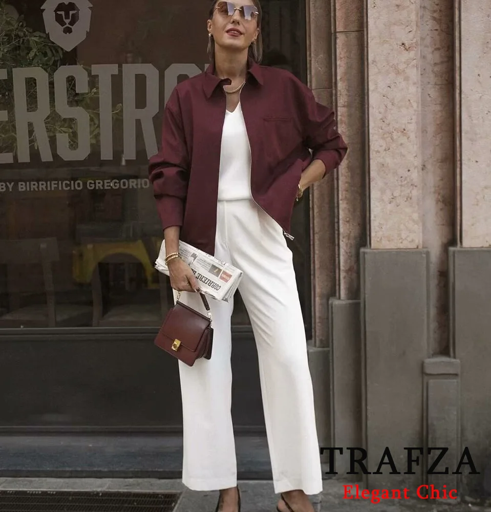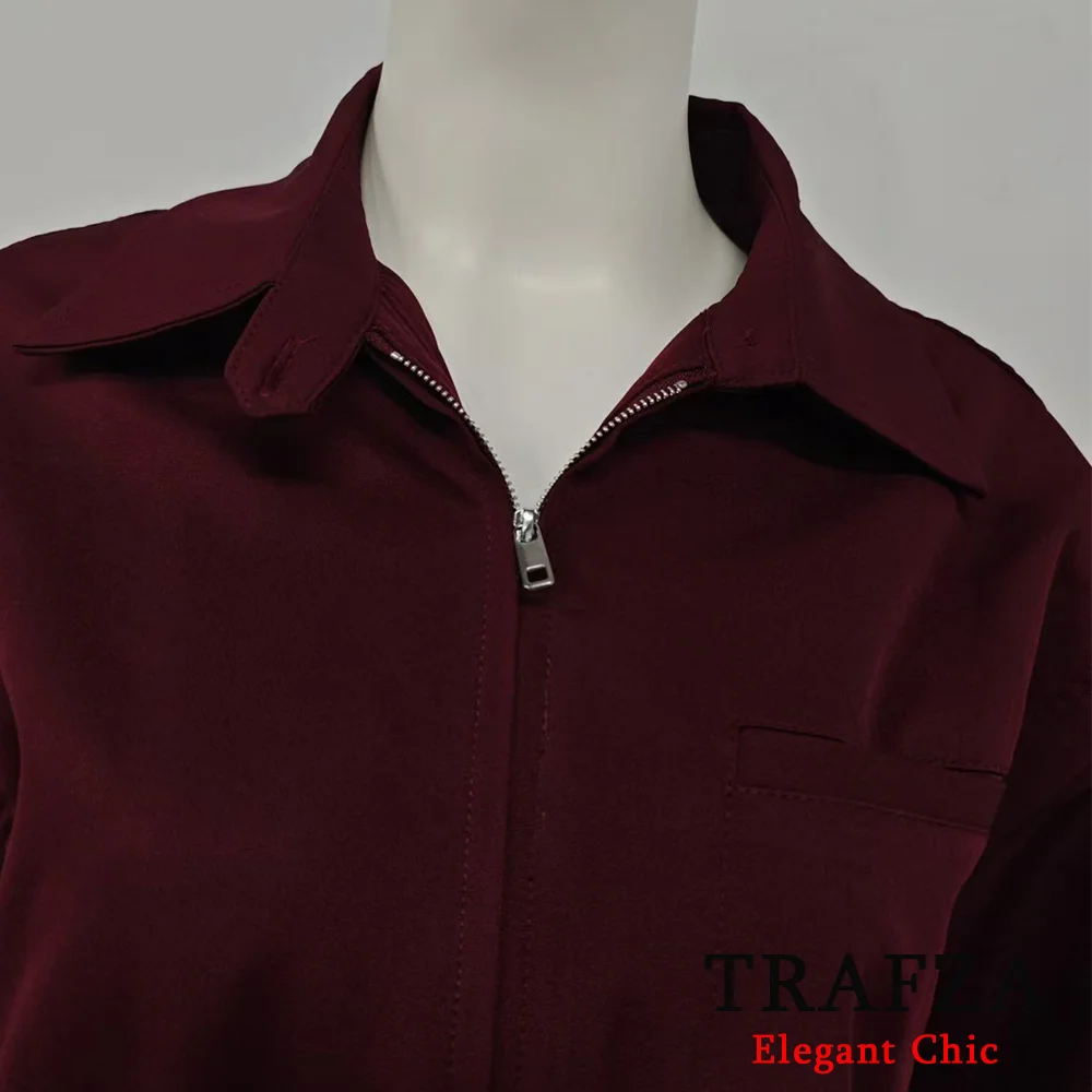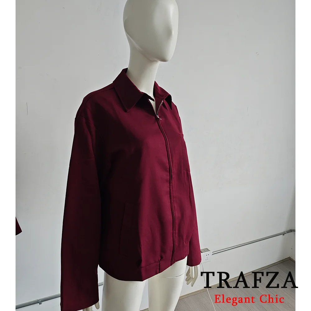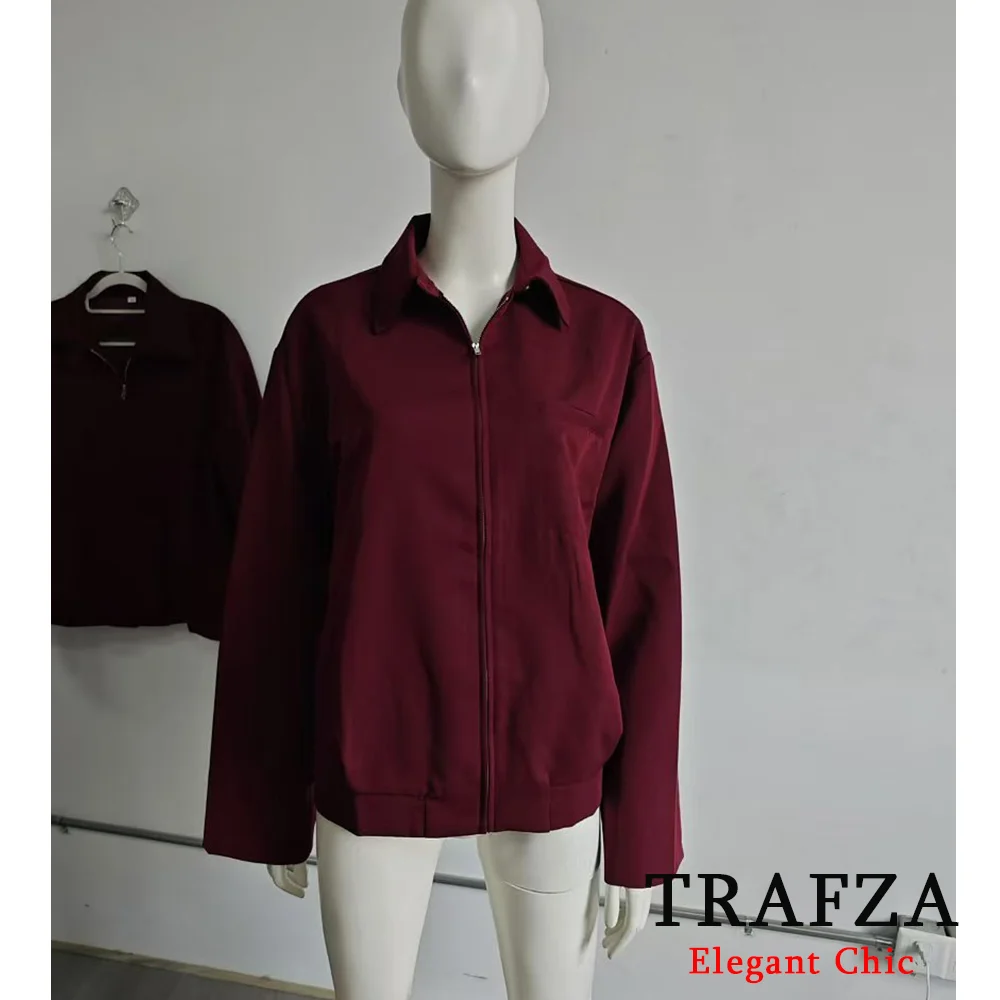Trafza-Women Vintage Loose Zipper Jacket Lapel Burgundy Color Jacket New 2025 Spring Autumn Fall Fashion Casual Commuter Jacket