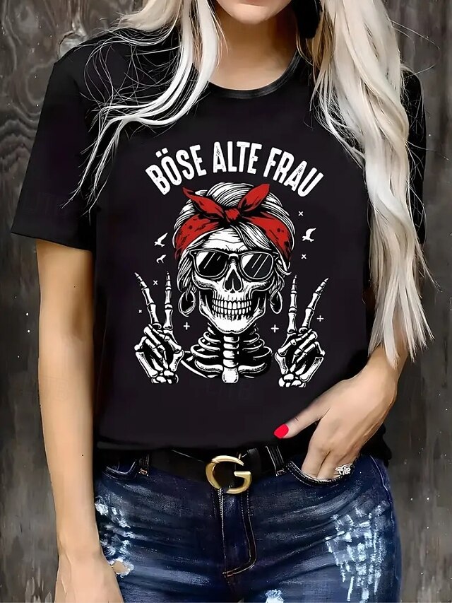 Halloween Women's T Shirt Skulls Cotton Shirt Graphic Flag Vintage Stylish Classic Short Sleeve Crew Neck Regular Tops Daily Print Black White Summer 5