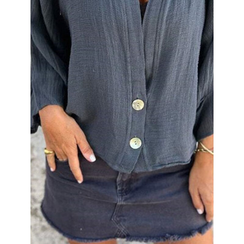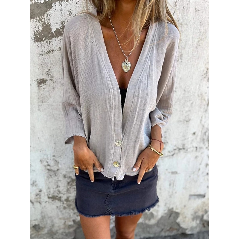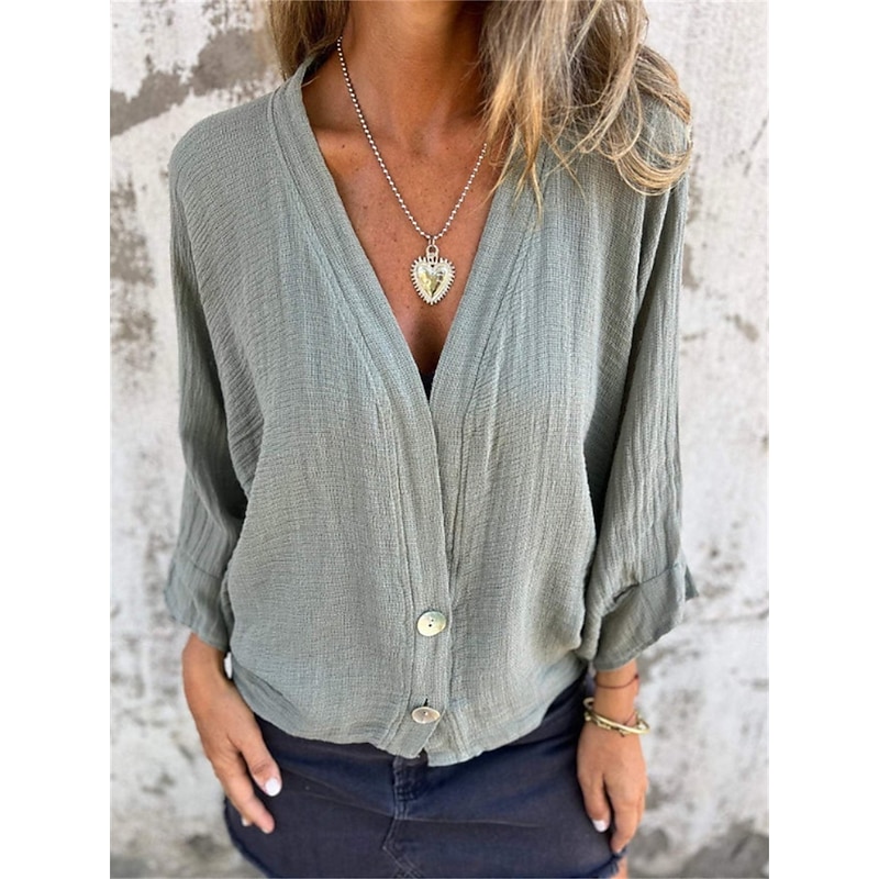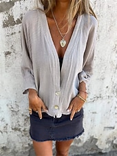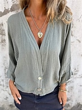 More information about Women's Linen-Inspired Shirts Button Up T Shirt Plain Fashion Modern Casual Long Sleeve V Neck Regular Tops Daily Weekend Patchwork Buttons Sage Green Yellow off-white Gray Spring Fall