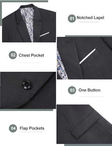 • Classic Suit Jacket: Featured with notched lapels,one button closure,a chest pocket,two flap pockets and two inner pockets.The slim fit suit jacket combines timeless elegance with a slim-fit cut for a sharp, tailored look.The two vent at the back enhances mobility while maintaining a sleek drape.