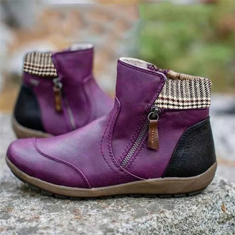 Highlights [Fabric and Material] : Crafted from high-quality PU leather, these women's ankle boots combine durability and style. The sleek black design is enhanced by a striking houndstooth pattern collar, which adds sophistication and a touch of contrast. The sturdy rubber outsole ensures stability and long-lasting wear. [Fit and Style] : The boots feature a round toe and flat heel design for enhanced comfort and a casual, vintage aesthetic. The convenient side zipper provides easy wearability and a secure fit, making these boots a practical choice for everyday activities. [Design Highlights] : These ankle boots are adorned with a unique plaid collar and color block detailing, adding a classic yet modern flair to any outfit. The flat heel ensures a comfortable fit for extended wear, while the side zipper enhances functionality. [Occasions] : Ideally suited for daily wear and outdoor activities, these boots provide a polished look whether you're heading out for a casual day or dressing up for a night out. Perfect for the colder months, their warm interior lining ensures comfort in spring, fall, and winter. [Size Range] : Available in a wide range of sizes, from EU 35 to EU 43, these boots cater to diverse sizing needs, ensuring a perfect fit for various foot sizes.