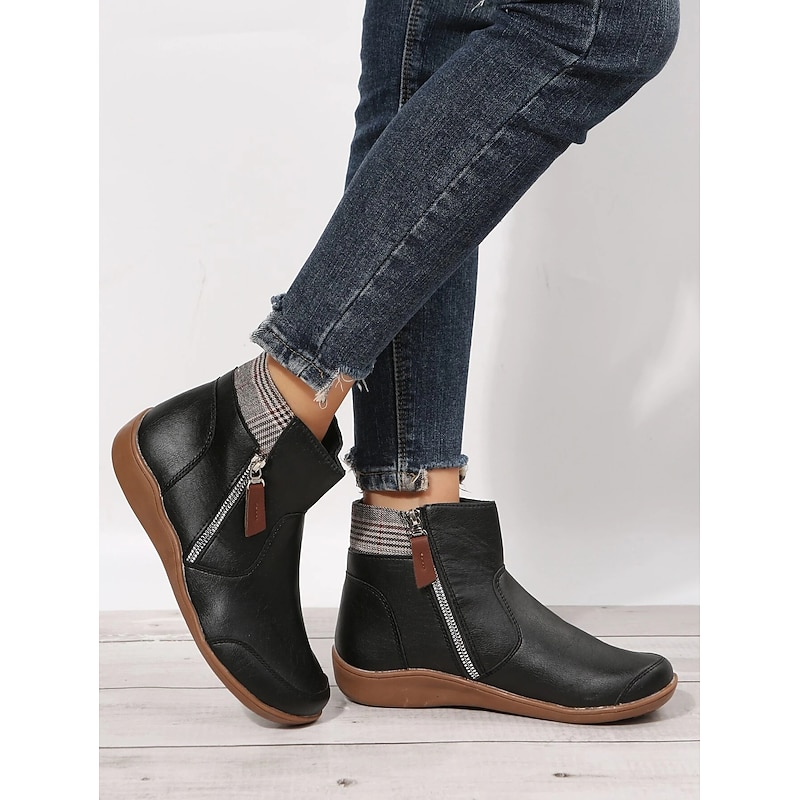 HOT ! Women's Black Faux Leather Ankle Boots with Plaid Collar and Side Zipper, Comfortable Casual Footwear for Everyday Wear