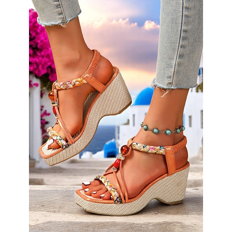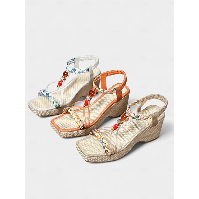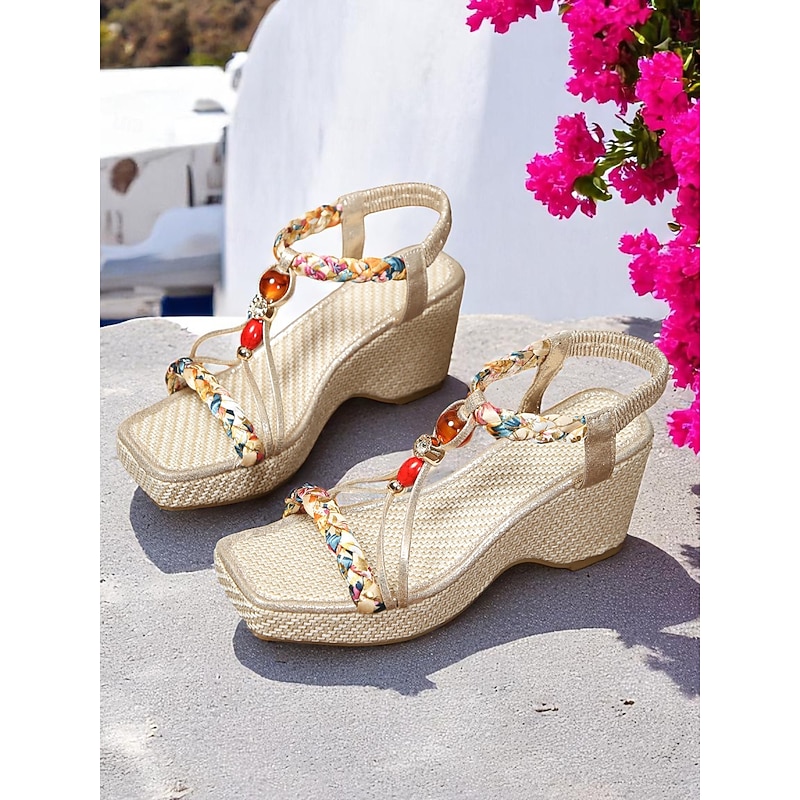 Women's Beaded Strap Wedge Sandals – Boho Summer Shoes with Gem Accents for Resort Wear and Seaside Vacations 1