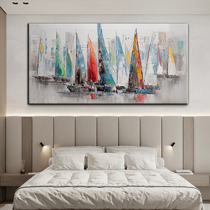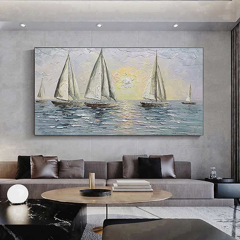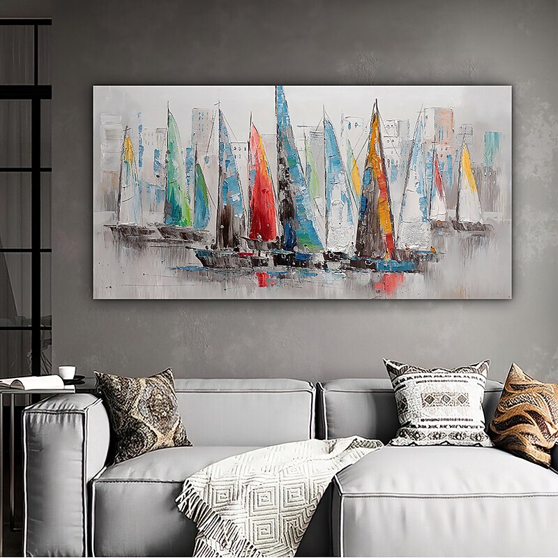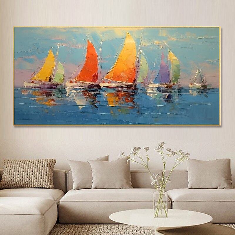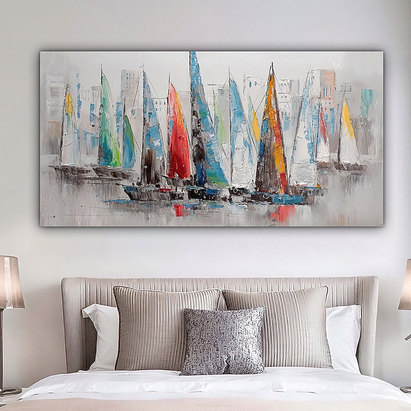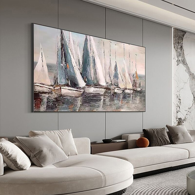 More information about Handmade Hand Painted Oil Painting Wall Art Abstract Blue Sea Boat Paintings Home Decoration Decor Rolled Canvas No Frame Unstretched