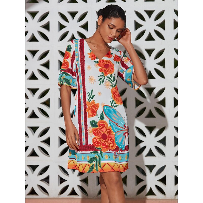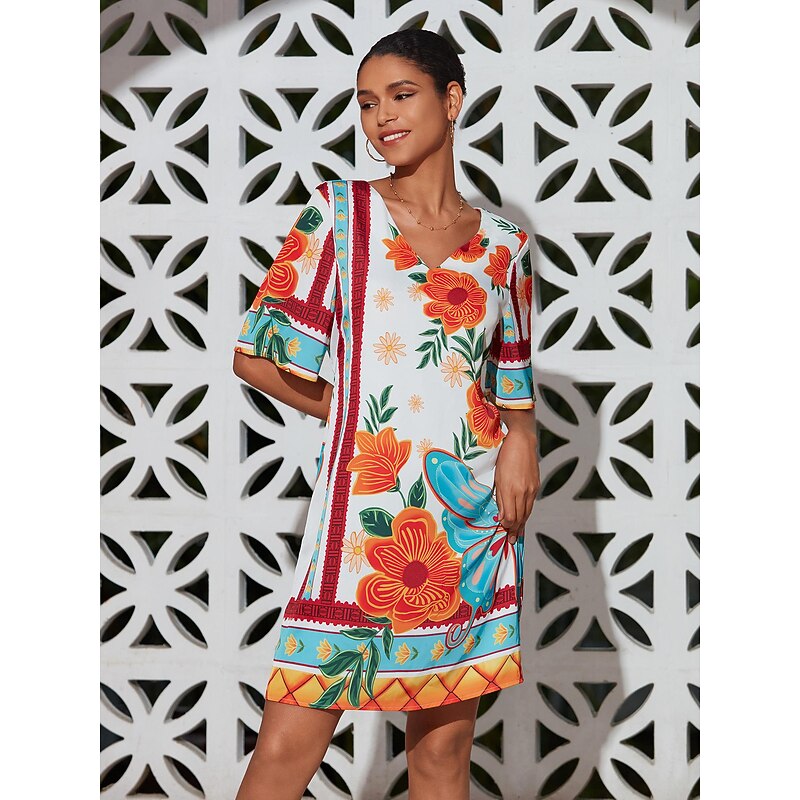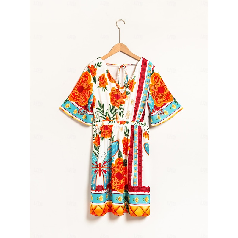HOT ! Women's Mini Dress Floral Print V Neck Half Sleeve Summer Dress Orange Flower Pattern Casual Vacation Beach Outfit Elegant Style