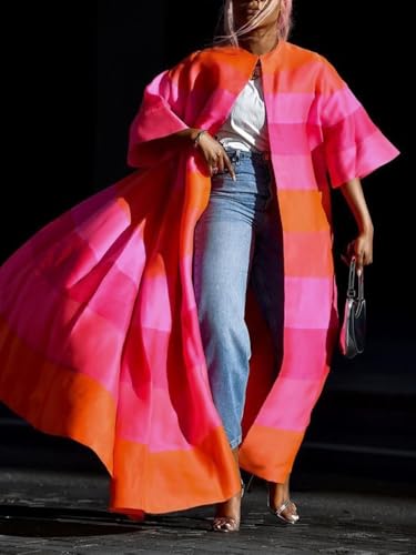 UOOZEE Women's Oversized Striped Lightweight Long Coat Open Front Pink Orange Color Block Kimono Jacket Casual Outerwear 1