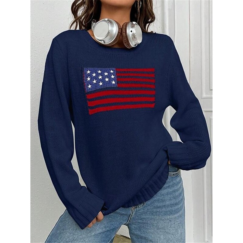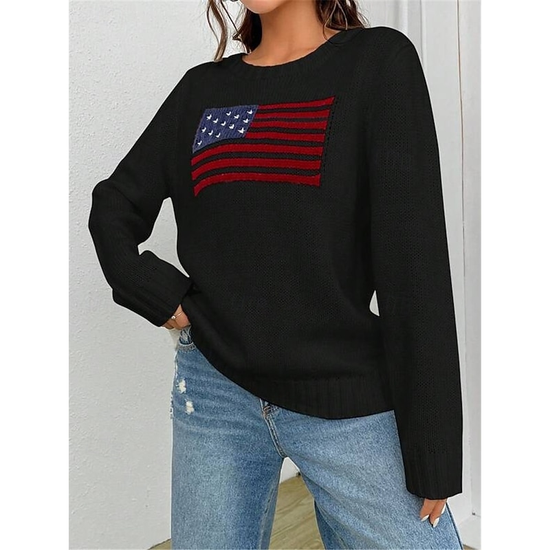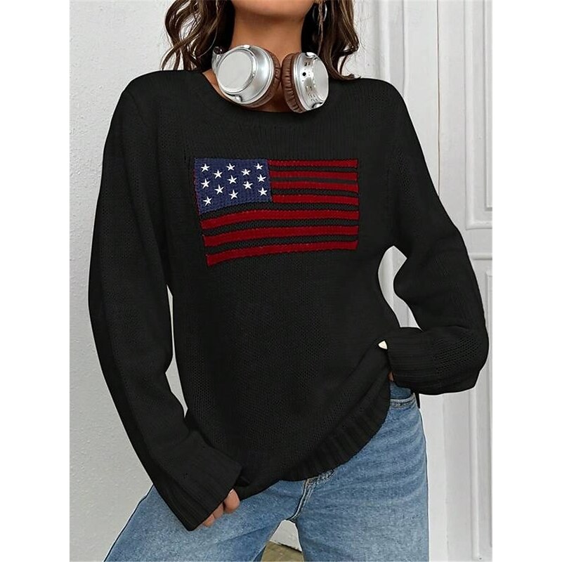 Highlights [Fabric] Crafted from soft, breathable knit fabric, this women's sweater offers a warm and cozy feel, perfect for the cooler seasons of fall and winter. With its stretchy composition, it ensures all-day comfort and ease of movement. [Fit] Featuring a classic crewneck and a regular fit, this sweater provides a relaxed yet stylish silhouette. Ribbed cuffs and hem maintain the garment's shape, offering a refined touch. [Design Highlights] Showcasing a striking American flag graphic on the front, this sweater adds a patriotic flair to your wardrobe. The versatile white color enhances its ability to be effortlessly styled with various outfits. [Occasions] Ideal for casual outings, daily wear, and going out, this sweater seamlessly blends comfort with style. Whether you're heading to a weekend gathering or a casual day out, it's a perfect choice for various settings. [Size Range] Available in sizes S, M, and L, this sweater accommodates different body types, allowing you to find the perfect fit for your style and comfort needs.