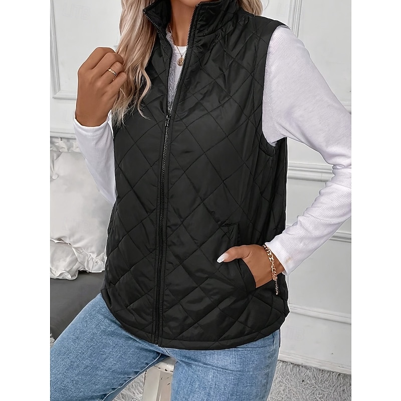 Highlights [Fabric] Crafted from a vintage black quilted fabric, this women's vest features a diamond quilted design that adds a touch of texture and sophistication. The inner lining is made of plush, soft faux fur in a light gray shade, ensuring warmth and comfort. [Fit] The vest boasts a tailored fit that enhances silhouette while remaining comfortable for layering over other garments. Its sleeveless design offers versatility, allowing it to adapt seamlessly to various weather conditions. [Design Highlights] Featuring a full-length zipper closure, this vest not only provides ease of wear but also adds a sleek element to its overall appearance. The high turtleneck enhances warmth and offers an extra layer of style and sophistication. [Occasions] Perfect for casual outings or outdoor adventures, this vest is an ideal choice for the transitional seasons of spring and fall. Its chic aesthetic paired with practical functionality makes it suitable for a variety of activities, from leisurely walks to weekend getaways. [Sizes] Available in a range of sizes from S to XL, ensuring a suitable fit for different body types and preferences. Perfect for everyday use. top-grade materials and excellent craftsmanship ensure long-lasting durability.