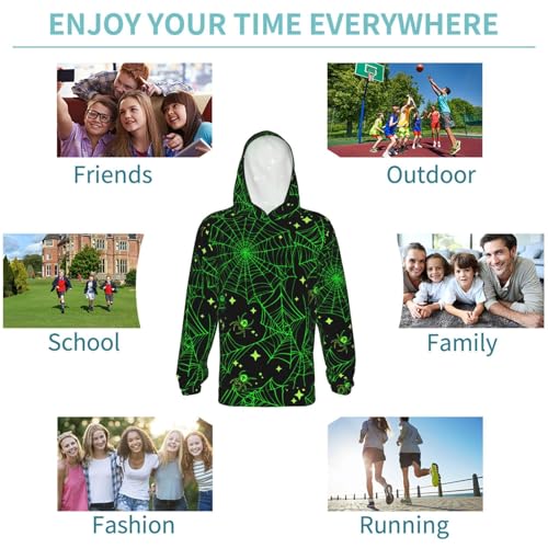 Green Bright Web with Spiders Kid Hoodies Boys Sweatshirts Girls Pullover with Pocket 4