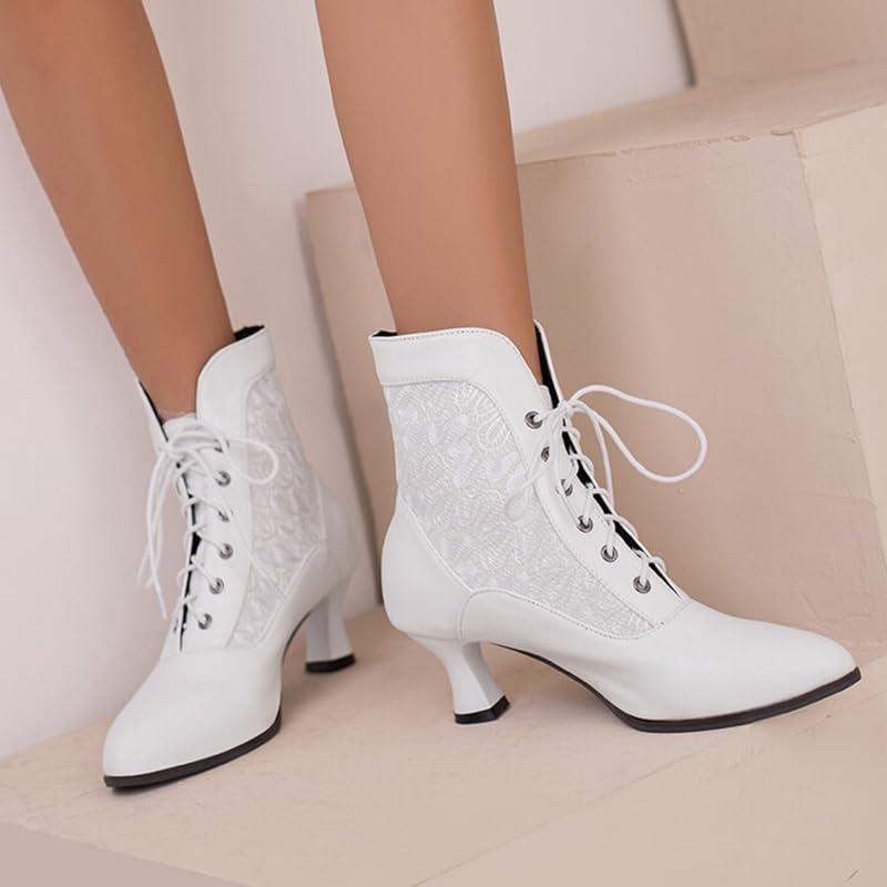 RiceelSor Women Lace Pointy Toe Kitten Heel Victorian Witch Boots Lace Up Round Toe Comfortable Bridal Costume Chunky Heel Plus Size Ankle Booties 7