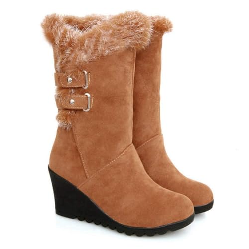 Women's Winter Fur Wedge Snow Boots Faux Suede Mid Calf Cold Weather Buckle Platform Fleece Lining Warm Wedges Snow Boots 5