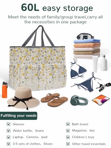 Mesh Beach Bag Oversized Tote Bags for Women Spring Flower Vines Retro Linen Large Travel Pool Bags with 8 Pockets