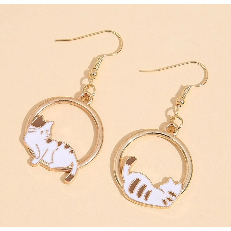 Highlights [Fabric]: These charming drop earrings are crafted from a durable alloy material that promises both comfort and longevity, making them ideal for daily wear. The gold-toned finish adds a touch of elegance and sophistication to the playful design. [Fit]: Designed with a lightweight construction, these earrings ensure comfort throughout the day. The drop style enhances their charming swing, making them both playful and trendy. [Design Highlights]: Featuring a whimsical cat and moon theme, these earrings showcase a geometric shape with a circular gold-toned frame. Inside the frame, a cute cat design is crafted in enamel, featuring white and brown accents. The dangling hook style adds an elegant sway with every movement, capturing a fun and sophisticated look that is sure to stand out. [Occasions]: Perfect for a variety of settings, from casual street outings to special dates or birthdays. These earrings make an excellent gift choice for cat lovers and fashion enthusiasts, adding a playful touch to any ensemble and suitable for festivals or as a charming everyday accessory. [Size Notice]: One size fits all, designed for women's wear. The drop style is versatile and complements various face shapes and hairstyles, enhancing your overall look with ease.