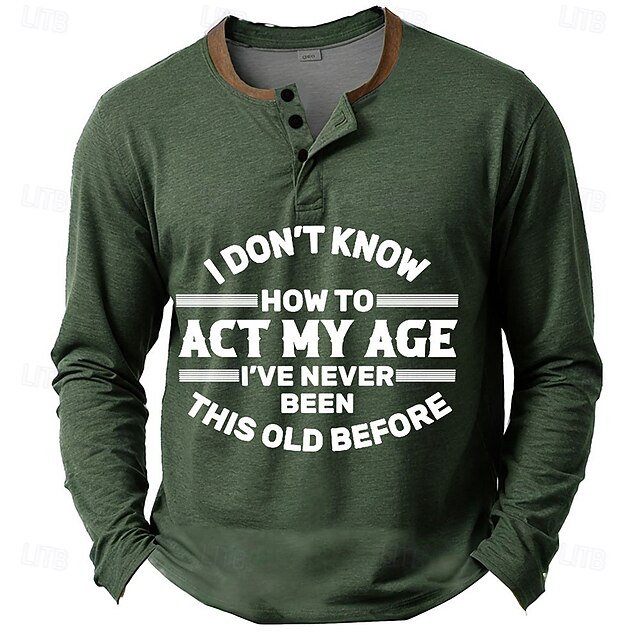 Men's Funny Graphic Long Sleeve Henley Shirt with 'I Don't Know How To Act My Age' Quote 8