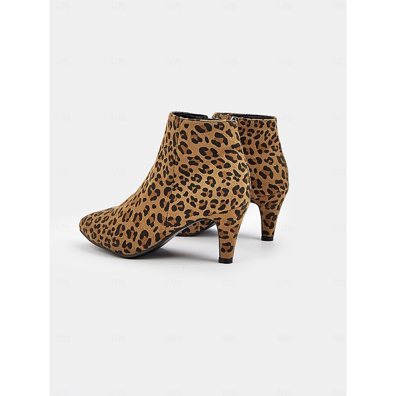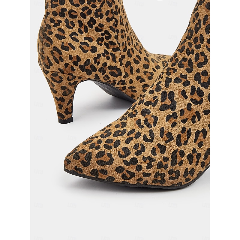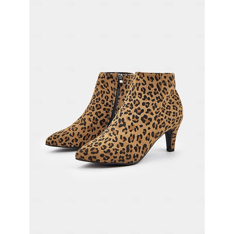 Highlights [Fabric] Crafted from high-quality faux suede, these women's ankle boots offer a soft and luxurious touch, ensuring comfort and style for all-day wear. [Shape] Featuring a sleek silhouette with a pointed toe, these boots have a modern and chic design that effortlessly enhances any ensemble, making them a fashionable staple for your wardrobe. [Design Highlights] The bold leopard print pattern gives these ankle boots a striking and trendy appearance. The stiletto heel provides an elegant lift, and the convenient zipper closure ensures easy wear while maintaining a sophisticated look. [Occasions] Perfect for both casual and semi-formal outings, these boots are versatile enough for daily wear during the spring, summer, fall, and winter seasons. Whether you're dressing up for a night out or adding flair to your everyday look, these booties are an ideal choice. [Size] Available in a range of sizes from US5.5 to US10.5, these boots fit true to size. Select your usual size for the perfect fit that complements your fashion-forward collection.