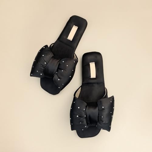 Women's Rhinestones Bow-Knot Satin Flat Slippers Open-Toe Pure Color Bridal Flips Flops Hand Sewn Slides Shower Wedding House Shoes 5