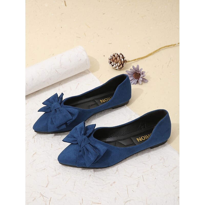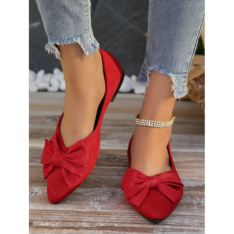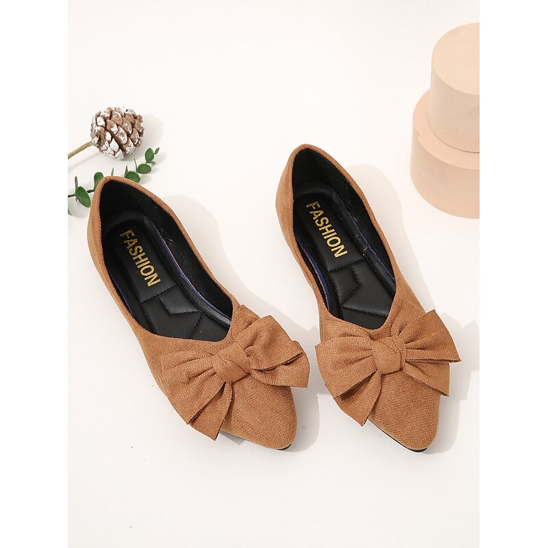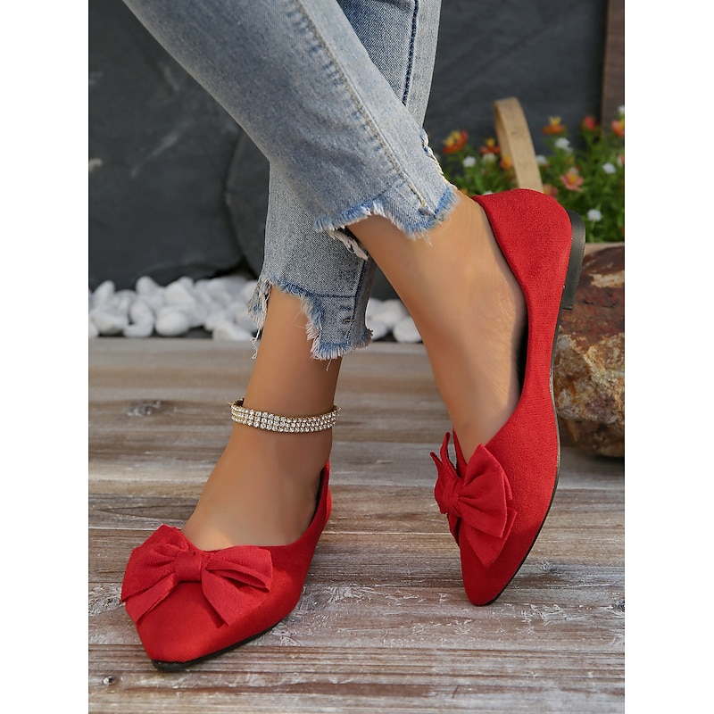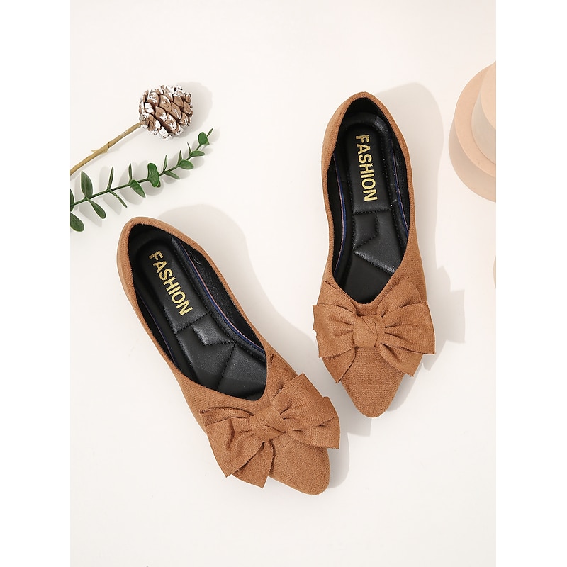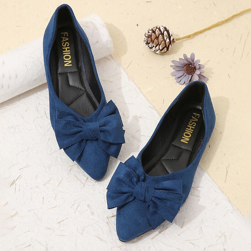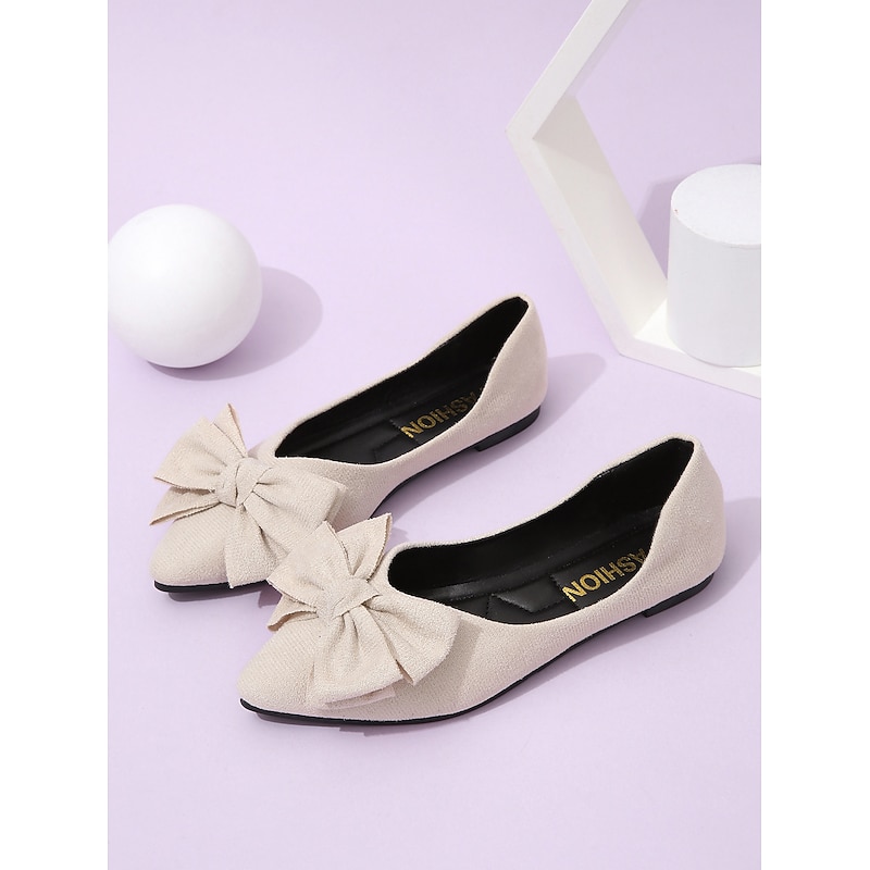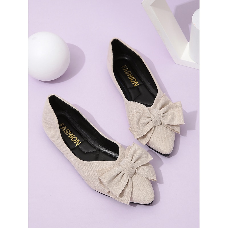 : The sophisticated pointed toe is complemented by a large, decorative bow on the front, adding a playful yet chic element to the overall minimalist design. The smooth inner lining ensures a snug and comfortable fit.