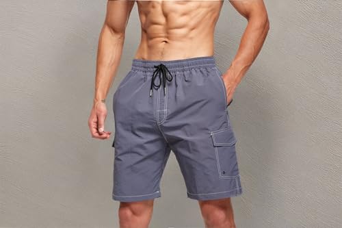 • Nice style of Mens swim shorts: 2 side pockets and 2 cargo pockets really well and look smart, big enough to storage small items. Adjustable drawstring with elastic waist delivering a custom fit and feel