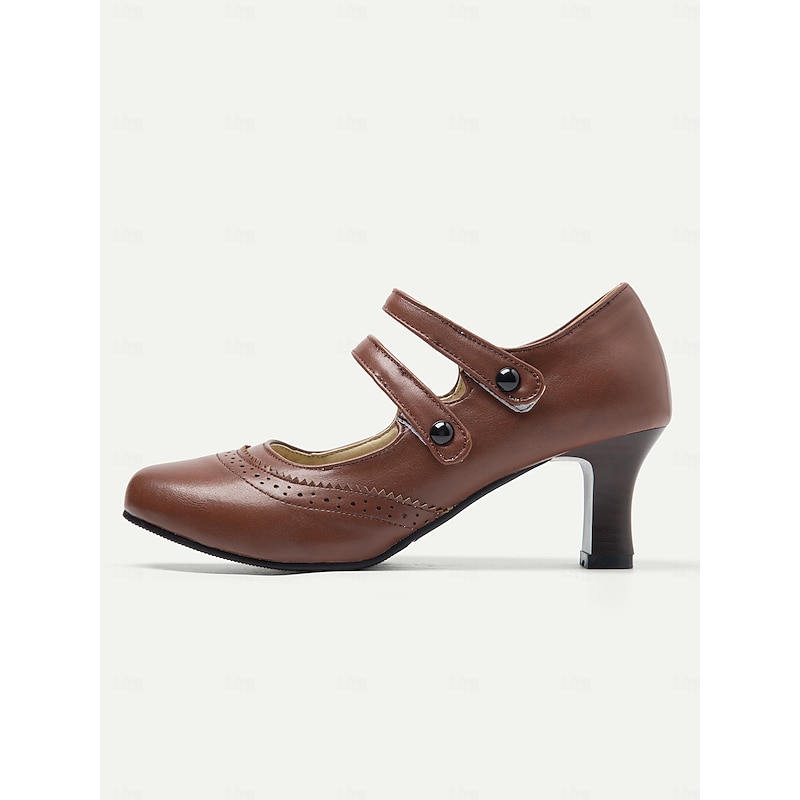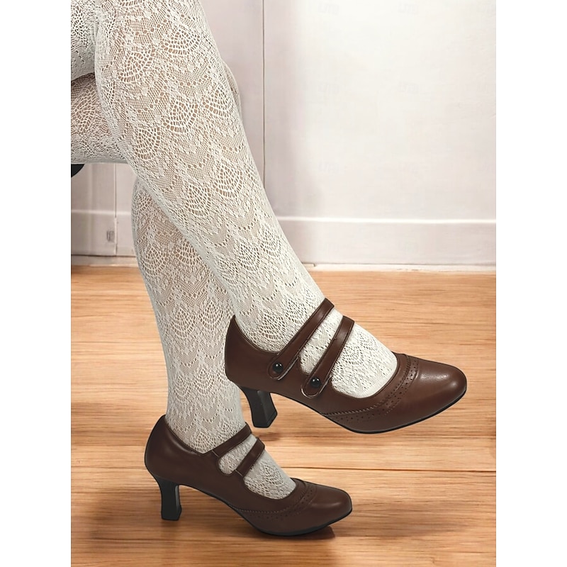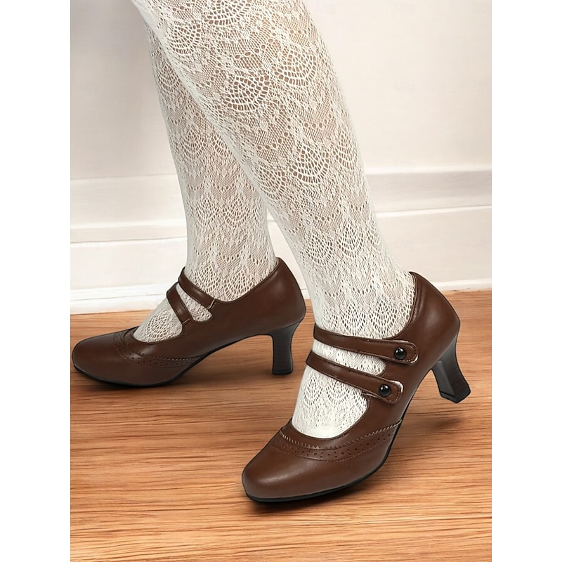 HOT ! Women's Vintage Gatsby Brown Mary Jane Heels with Brogue Detailing, Comfortable Mid Heel Shoes for Retro-Inspired Outfits