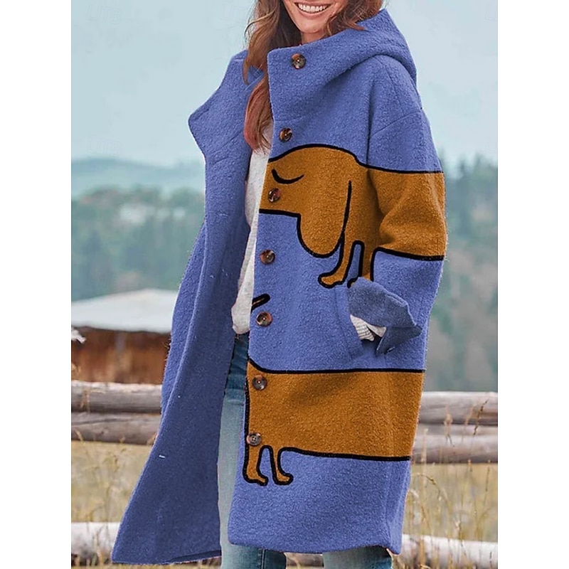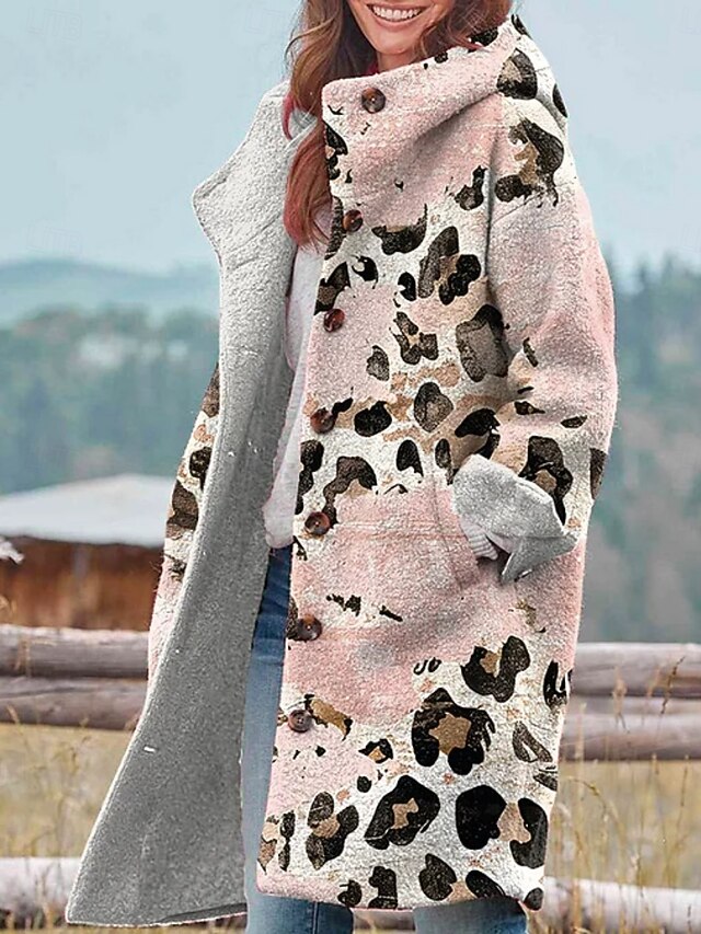 Women's Winter Jacket Fleece Jacket Coat Warm Breathable Pocket Buttons Print Active Daily Casual Animal Vacation Street Daily Single Breasted Long Hoodie Regular Fit Long Sleeve Outerwear Black 1