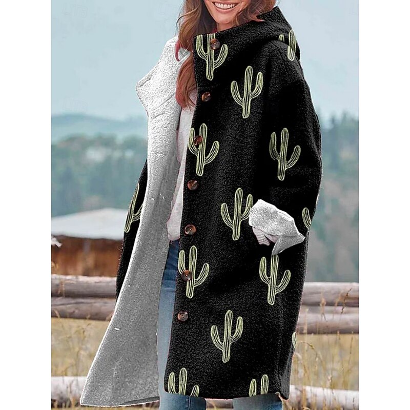 HOT ! Women's Winter Jacket Fleece Jacket Coat Warm Breathable Pocket Buttons Print Active Daily Casual Animal Vacation Street Daily Single Breasted Long Hoodie Regular Fit Long Sleeve Outerwear Black