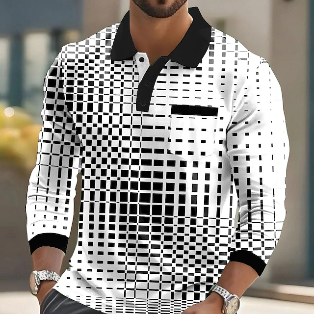 More information about Men's Geometric Polo Long Sleeve Polo Shirts Collared Shirts Business Casual Business Athleisure Daily Wear Buttons Pocket 3D Print Spring Fall Winter Black Blue Sky Blue