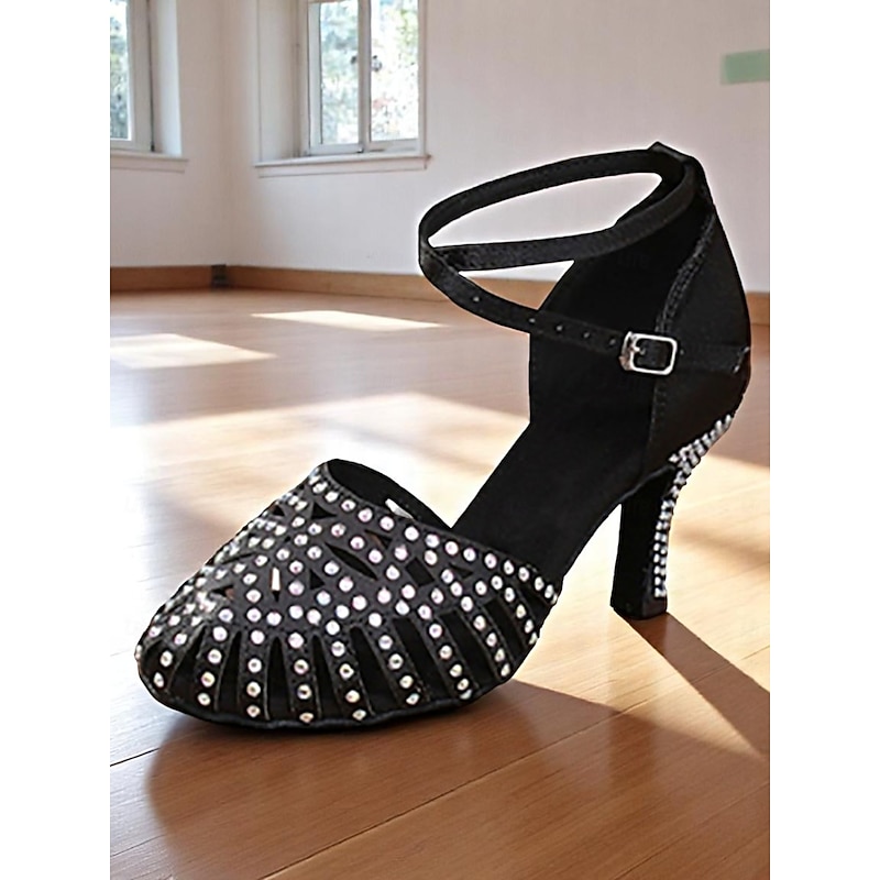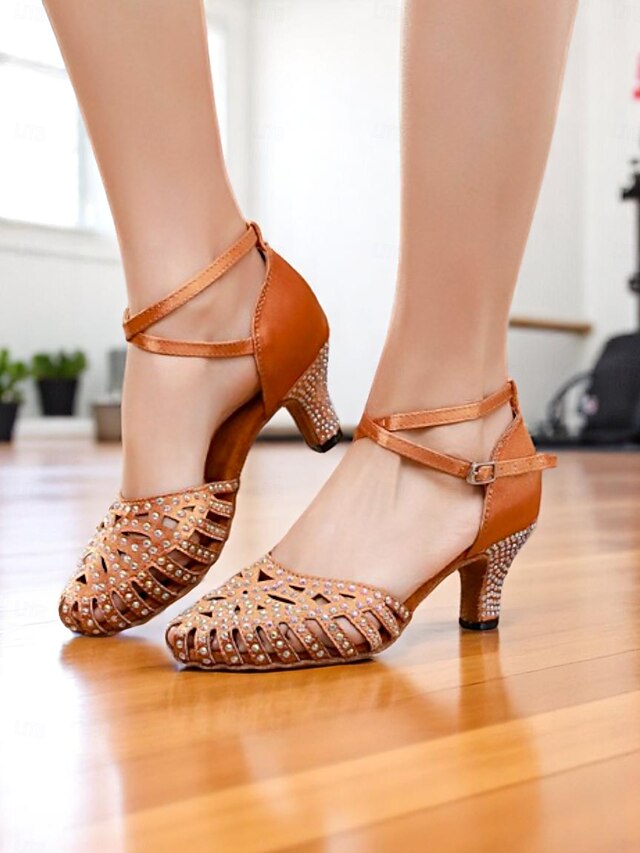 HOT ! Women's Brown Rhinestone Closed-Toe Dance Shoes – Sparkly Mid Heel Latin & Ballroom Shoes for Practice & Stage