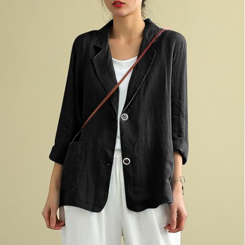 Womens Linen Suit Shirts Jackets Solid Color Long Sleeves Button Notched Collar Business Casual Blazer Blouse Tops 1
