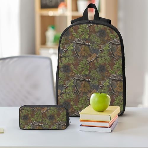 Ergonomic Backpack Set with Insulated Food Carrier & Multi-Pocket Pencil Case (3pc Waterproof Combo for Hiking/Commuting, Hunting Camo Trees Branches Military Camouflage) 3