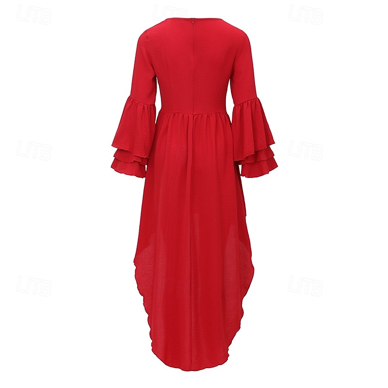 Highlights - Perfect for summer wear - Made from high-quality polyester fabric - Features elegant long sleeves - Designed for women - Classic style with ruffle and asymmetrical details - Flattering V-neckline - Mini dress length adds a touch of sophistication