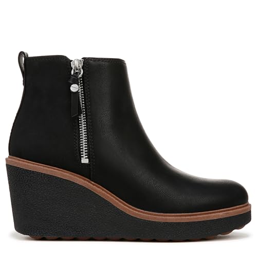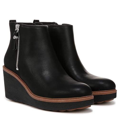 • STYLE: Wedge ankle boot with round toe, outside zip, pull tab, and 3 inch wedge heel and 1 inch platform. FIT: Side zipper and back pull tab for easy on/off.