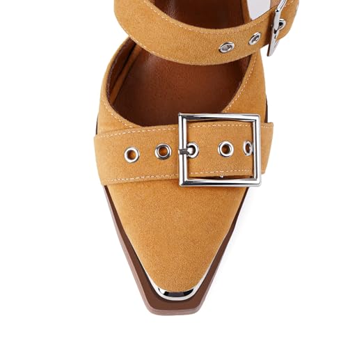 CORNMOOD Pointed Toe Chunky Heels for Women Metal Buckle Strappy Medium Thick Wedge Western Stacked Heel Sandals 6