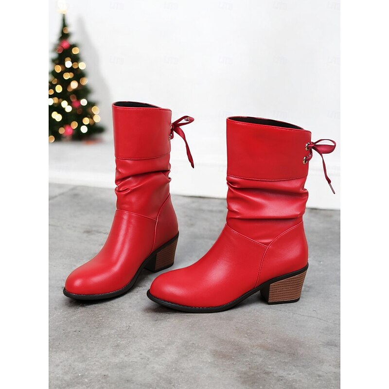 Women's Red Faux Leather Mid-Calf Boots with Bow Detail and Block Heels – Festive Winter Footwear for Christmas and Parties