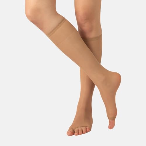 • MAIN PRODUCT CHARACTERISTICS: Our 2 pairs open toe knee high socks offers a light fabric, sheer 10 denier ultra soft socks for women. Easy to get on and off. No cramped toes. Great at keeping your feet dry and moisture free. We offer a one size freetoes over the calf sock in black or nude color. Designed to fit women 4 feet 11 inches to 6 feet tall and between 170-284 pounds weight. In addition, its elastic wide top band stays up without slipping down. Hand wash only and drip dry. Do not bleach.