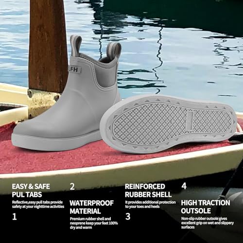 • 【Comprehensive Optimization & Upgrade】: Deck boot shoe is more important for anti slip grip, waterproofness, wear resistance and durability, so we have adopted more professional & high quality materials, More professional structural design, Meticulous craftsmanship. The lightweight and ankle height of rubber ankle boots make walking comfortable.