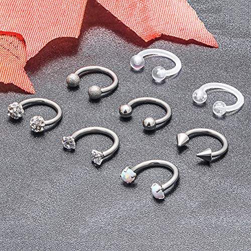 • UNIQUE SET--One Order Including 8 Pieces Circular Horseshoe Barbell Piercing Jewelry in 6 Styles(Ball/Cryatal Paved Ferido Ball/Clear Diamond CZ/Spike/Matte Ball/Bioflex Clear Acyrlic/Glitter/Opal).