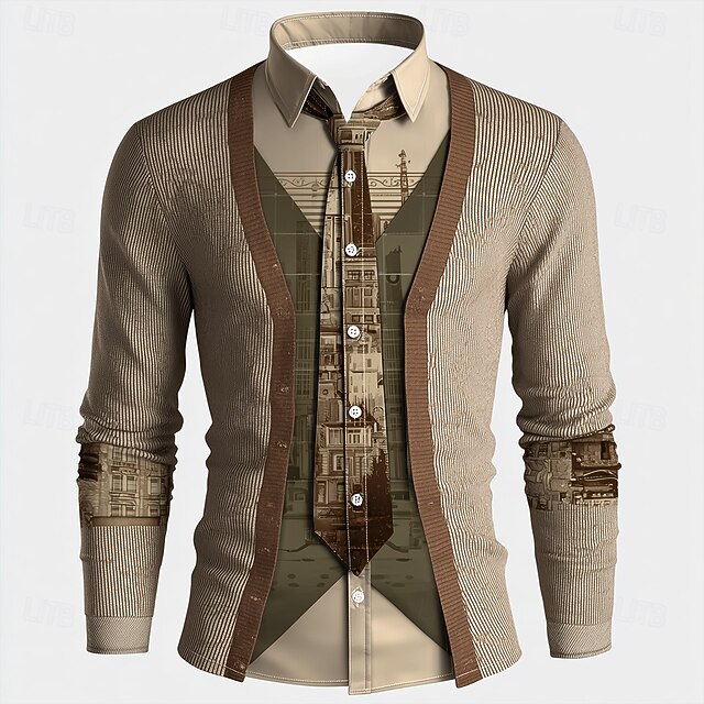 Men's Novelty Faux Collar and Cardigan Design Shirt Button Up Shirt Long Sleeve Vintage Retro Outdoor Casual Daily Spring Fall Turndown 3D Print Collared Shirts Light Khaki Khaki 1