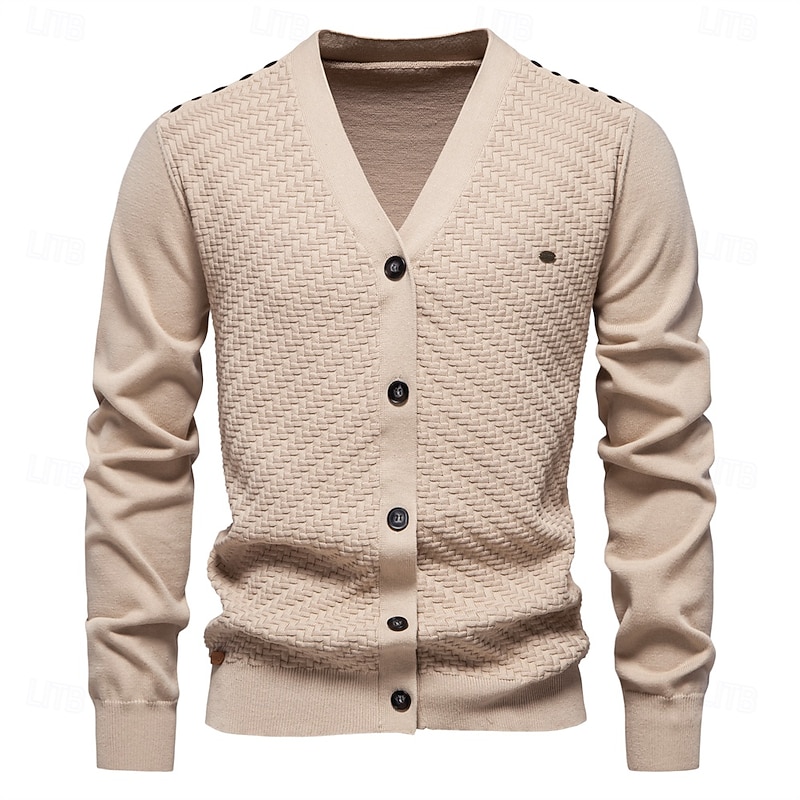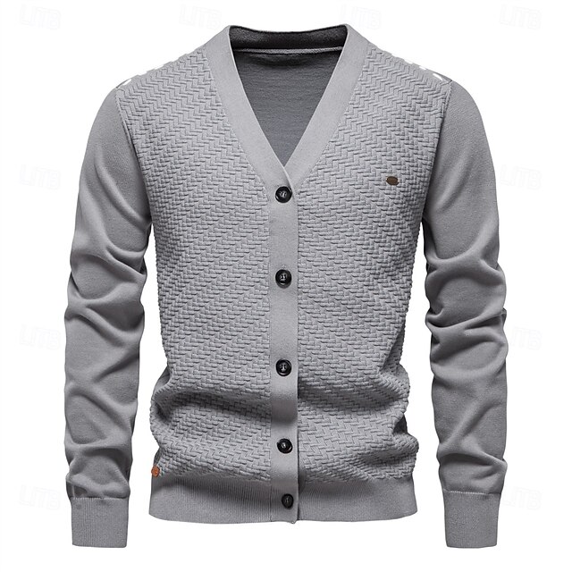 Highlights [Fabric]: This men's cardigan is crafted from a high-quality blend of 95% cotton and elastane, offering superior comfort and warmth during the fall and winter seasons. The micro-elastic material ensures ease of movement, while the ribbed and cable knit style adds texture and depth to the design. [Fit]: The cardigan offers a form-fitting silhouette with regular top length, making it a versatile choice for various body types. The ribbed cuffs and hem provide a snug fit, enhancing the sophisticated look. [Design Highlights]: Featuring a classic V-neckline, this cardigan is designed with a row of contrast buttons that give it a modern and customizable touch. The solid color pattern in versatile options like gray, dark navy, and khaki makes it easy to pair with any wardrobe. [Occasions]: Perfect for casual daily wear or more formal settings, this cardigan strikes the ideal balance between style and functionality. Whether you're heading to a social gathering or enjoying a relaxed day out, this sweater adapts to any setting with ease. [Size Range]: Available in a comprehensive size range from S to XXL, ensuring a comfortable fit for a wide variety of body types.