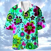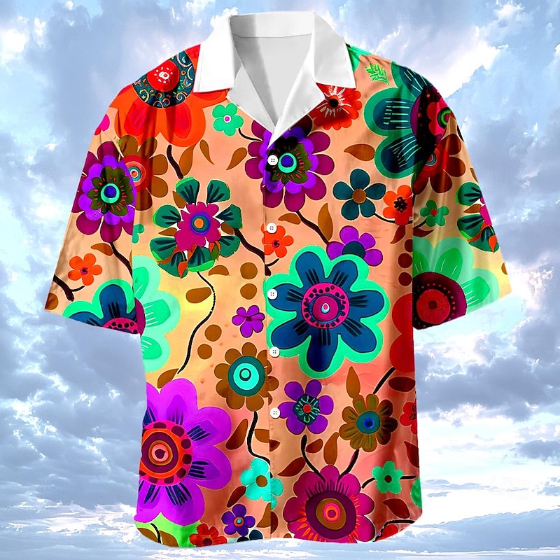: The shirt features a vibrant floral print with tropical flowers in shades of green, orange, and yellow. The design is enhanced with a traditional Cuban collar and a button-down style, offering a sophisticated yet casual look. The artistic 3D print of oversized flowers adds a bold statement to the overall design.