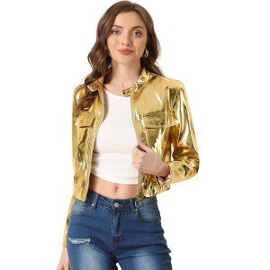 Allegra K Women's Metallic Stand Collar Zip Up Shiny Biker Holographic Cropped Jackets Gold Medium